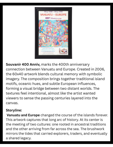 A commemorative artwork celebrating 400 years of cultural contact between Europe and Vanuatu, originally beginning with Spanish explorer Pedro de Quirós in 1606. The piece combines historical and mythological imagery in a colorful, celebratory visual narrative.